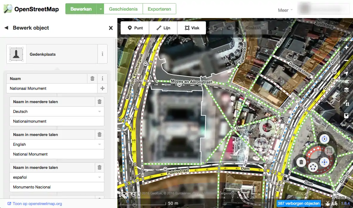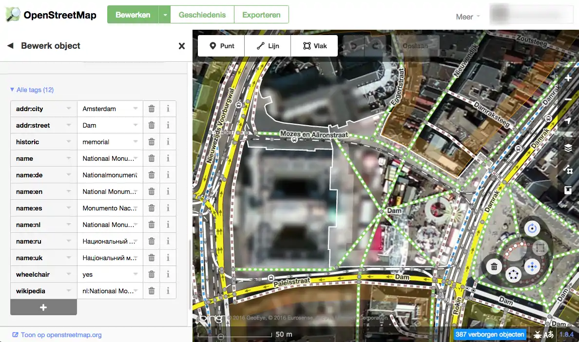 Maar uiteraard kun je ook alle gegevens laten zien die zich op de kaart bevinden, en dat is in onderstaand plaatje te zien. Tevens heb ik hierbij weer het monument op de dam geselecteerd en zie je rechts dezelfde velden die je ook in iD zag. Daaronder de knoppen waarmee je tags kunt toevoegen of bewerken.