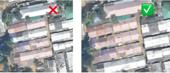 - The long blocks of several shelters should be divided in individual shelters. If you are using JOSM, you can use the terracer plugin which allows you to draw the whole extent of the building and then split it into x parts (mainly 6 here).