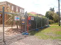 | temporary | Temporary_fence A type of fence constructed of free standing, self-supporting wire-mesh panels, held together with couplers and supported with counter-weighted feet, usually used around construction sites | ![]() |