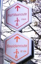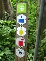 Natuurpunt has a large number of local walking routes all over Flanders. The routes, have one or several information signs - coloured symbols on a white hexagonal plate - with the name of the route, and the signs with arrows have, next to a colour, also a shape, like a rectangle or triangle. In some cases a logo is used, like the "Aardgas" logo.