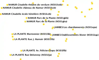 Le point jaune représente l'emplacement du poteau dans le fichier du TEC. Le nom de l'arrêt est ajouté par la suite, et visible uniquement aux plus grands niveaux de zoom. Le nom entre parenthèse reprend les références de l'arrêt.