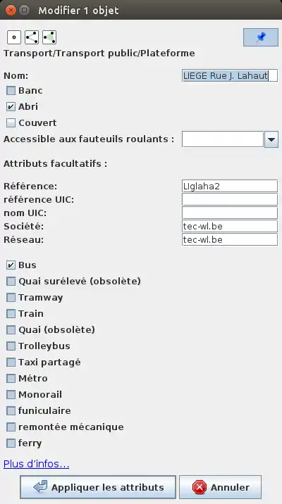 Dans JOSM, vous pouvez accéder à une fenêtre simple de modification, par le menu "Attributs > Transports > Transports Publics > Plateforme". Vous aurez alors la fenêtre suivante :