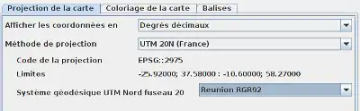 Celle-ci concerne l'île de la Réunion qui est passée de l'ancienne projection "Gauss Laborde Réunion" à l'UTM (zone 40 sud) en janvier 2010. Il faut d'abord choisir comme méthode de projection "UTM 20N (France)" et dans la liste déroulante Système Géodésique, spécifier "Réunion RGR92" (note : le titre "UTM 20N (France)" n'est plus approprié puisqu'il regroupe des zones UTM différentes et devra être corrigé dans JOSM).