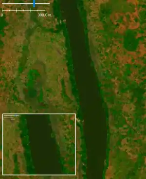| waterway=riverbank | Berge | Si une berge est visible sur l'imagerie satellite, elle doit être cartographiée comme un polygone. Une ligne pour la voie waterway=river doit être dessinée à l'intérieur de la berge comme indiqué sur la photo.