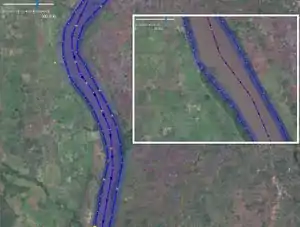 Si la rivière est saisonnière ou intermittente, veuillez ajouter les mêmes balises à la berge. Si une rivière porte un nom, appliquez ce nom à la ligne et non à la berge. Il peut être utilisé avec natural=shingle, pour plus de renseignement, veuillez voir ici landcover section. avec une largeur: >10 mètres. |