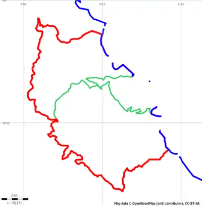 The national border of Luxembourg is a closed relation (ring) consisting of the ways of the physical border lines to Belgium, France and Germany.