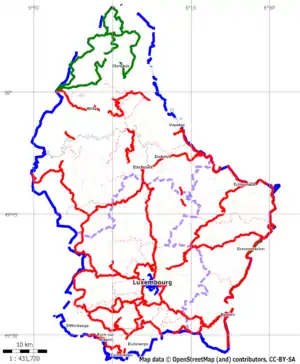 In Luxembourg, there are three main cycle route networks: the National Cycle Network (Pistes Cyclables, for more information see here); regional cycle routes (you'll find some here; and a local cycle network in Luxembourg City("Itineraires Cyclables de Ville de Luxembourg", some information on which is given here).