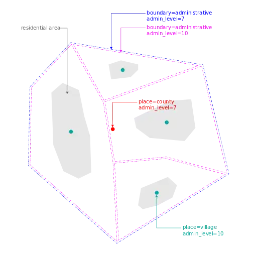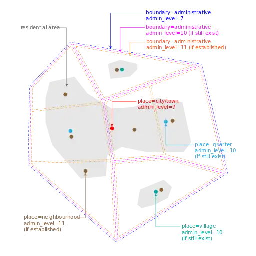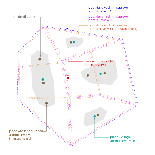 | Country | Administration | Administrative levels admin_level=* and place=* | Non-administrative settlement | ||||||||||