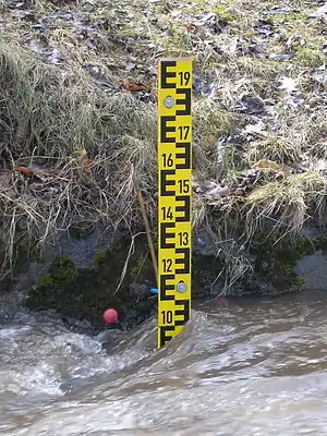 Used to indicate water levels in rivers, streams, lakes and other non-tidal areas, often to determine upstream flood levels during heavy rains.