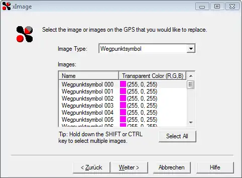 Es sind nun die Symbole zu wählen welche nachfolgend gegen die von der Festplatte ausgetauscht werden sollen. Die einzuspielenden benutzerdefinierten BMP-Dateien müssen wie folgt benannt sein: Wegpunktsymbol [lfd-Nr.].bmp wobei [lfd-Nr.] eine dreistellige Nummer mit ggf. führenden Nullen ist und von 000 bis 023 gehen darf.