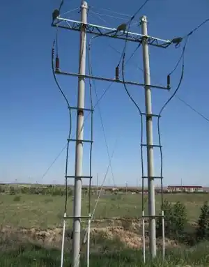 design | guyed_h-frame | 门式塔的拉线版本,由拉线支撑,在斯堪的纳维亚等地很常见。与门式塔相比,这种设计通常有非垂直的杆。这一细节对于在航空图像中区分h-frame和guyed_h-frame很有帮助,因为在这种图像中拉线通常太细而无法直接看到。 |